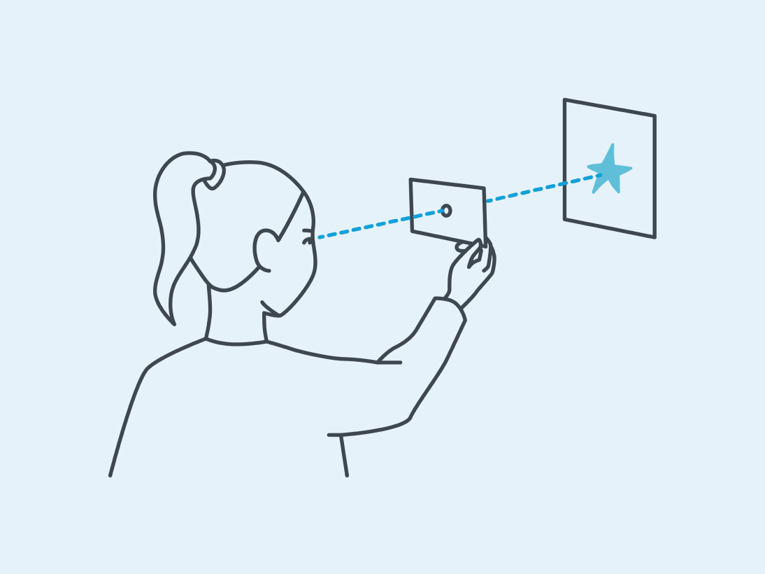 Hold the card in front of you at arm’s length. Position the card so that the target object is centered through the hole, while keeping both eyes open.