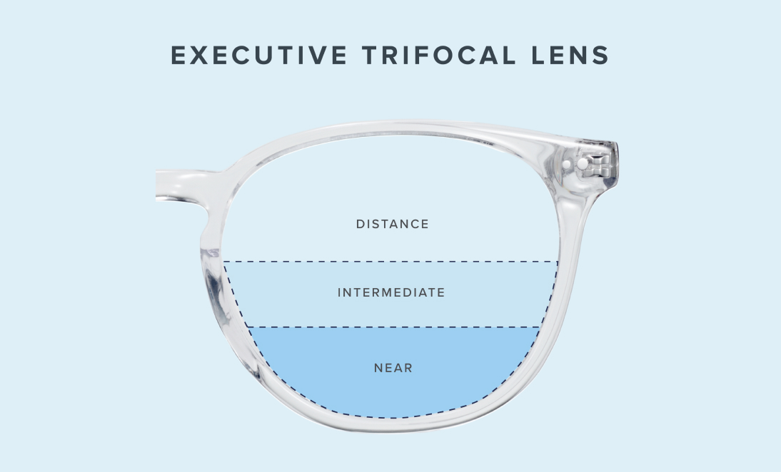 Executive trifocal lenses: The different viewing zones extend all the way across the glasses lens. These are also referred to as Franklin lenses, named for the inventor of bifocals, Benjamin Franklin.